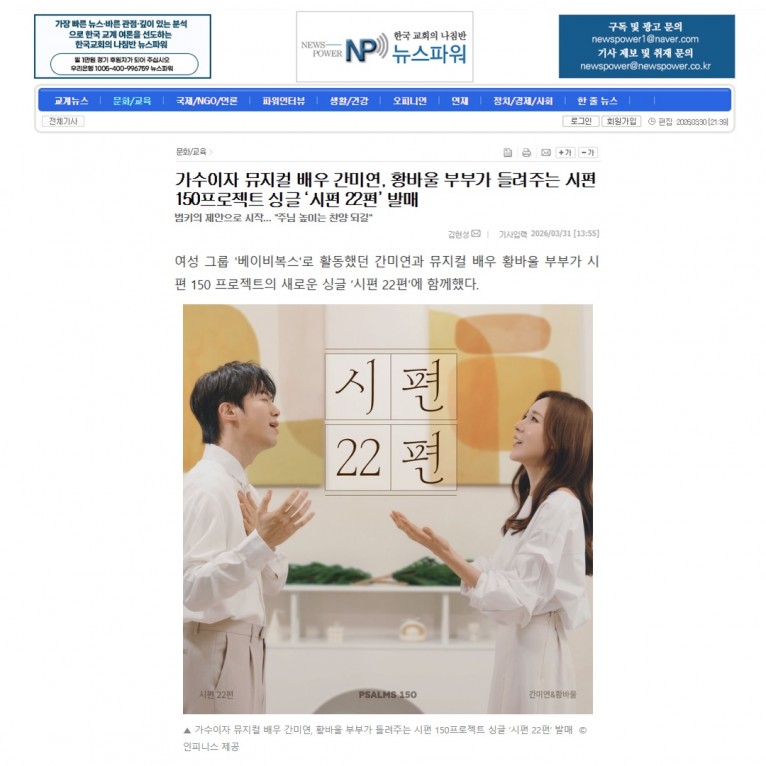 [기사] 가수이자 뮤지컬 배우 간미연, 황바울 부부가 들려주는 시편 150프로젝트 싱글 ‘시편 22편’ 발매(뉴스파워)