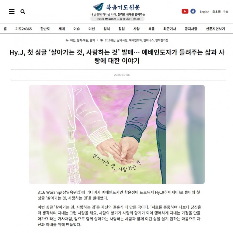 [기사] Hy.J, 첫 싱글 ‘살아가는 것, 사랑하는 것’ 발매… 예배인도자가 들려주는 삶과 사랑에 대한 이야기(복음기도신문)